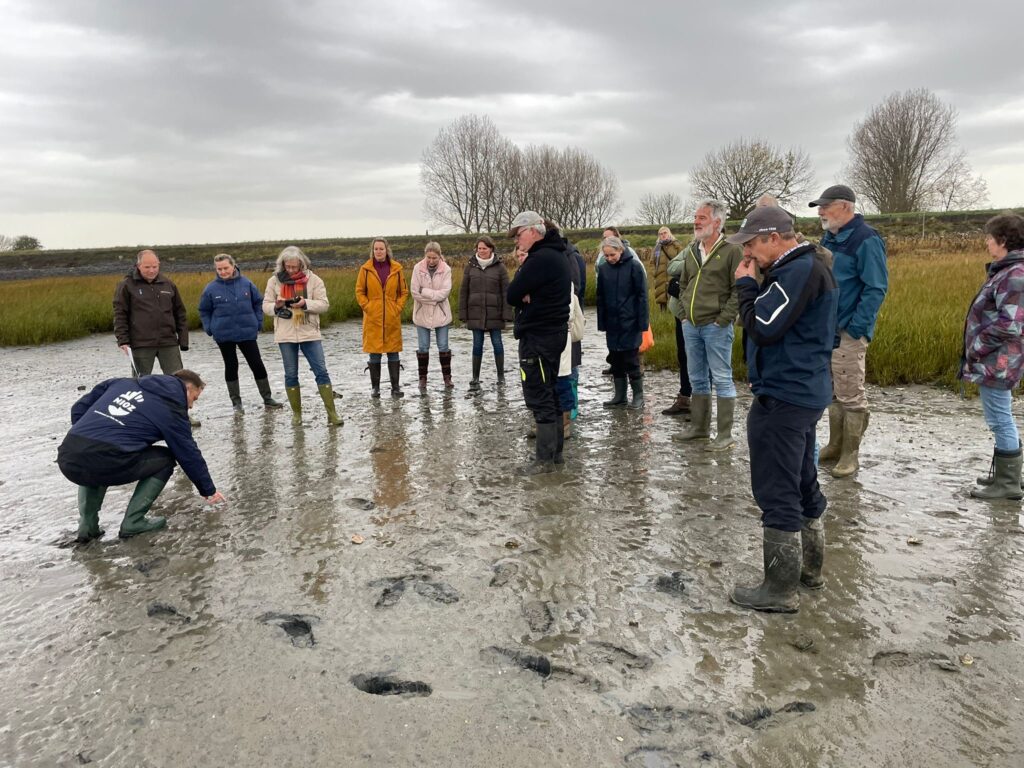 Vervolgens wandelend naar beneden door het slijkgras de slikken op. Hier kregen we uitleg van Robert Jentink (Rijkswaterstaat) over zeegras. Van grote betekenis in het vasthouden van het slib, voor een leek nauwelijks waarneembaar. Ook onderstreept hij het belang van het gehele gebied voor de waterveiligheid, de stevigheid van dijken.